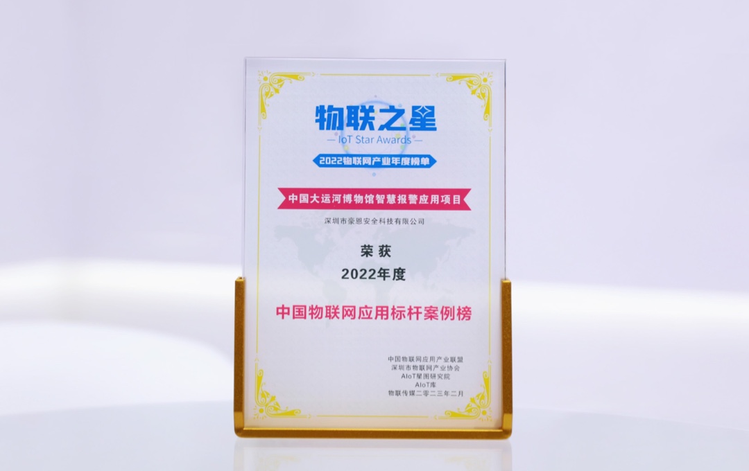 After months of intense competition, the China Grand Canal Museum Smart Alarm Application Project of China Security Technology subsidiary Haoen stood out from over hundreds of participating enterprises and was listed on the "China Internet of Things Application Benchmark Case List" of the 2022 "Internet of Things Star" annual list, becoming a typical representative case in Haoen Museum's security alarm solution.