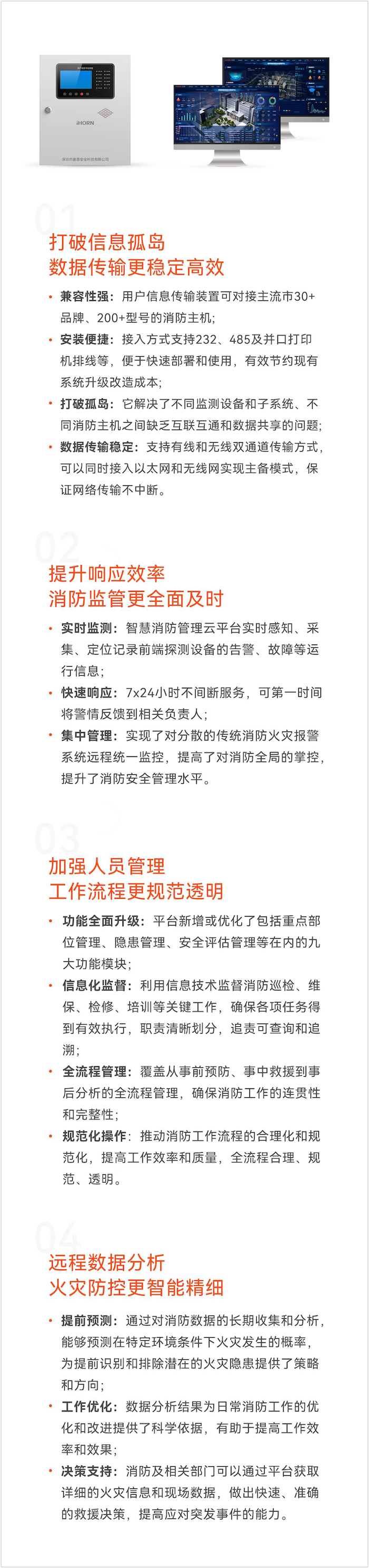 In response to the many drawbacks of traditional fire protection, such as difficult monitoring of equipment status, low efficiency of alarm response, difficult maintenance and supervision, and difficult data traceability, user information transmission devices, as key data transmission equipment, can achieve information collection and data uploading of traditional fire control hosts, centralized management and real-time monitoring of dispersed fire water, gas, electricity and other subsystems, playing an important role in improving fire safety management level, preventing and reducing the occurrence of fire accidents. This brand event is compatible with 30+brands and 200+models of fire protection hosts in the mainstream market. It supports both wired and wireless dual channel transmission methods and is easy to install. The Haoen user information transmission device, which supports 232, 485, and parallel printer cables, has attracted attention. As the flagship product of traditional fire intelligent upgrade solutions, the Haoen user information transmission device and intelligent fire comprehensive management platform have joined forces to break down data barriers, remotely share information, transform passive awareness into active monitoring, and effectively enhance perception and warning capabilities as well as emergency command capabilities.