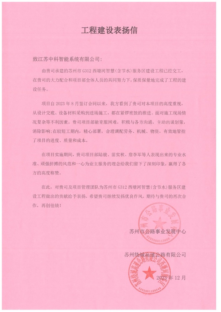 近日,蘇州市公路事業(yè)發(fā)展中心和蘇州繞城高速公路給中安科子公司中科智能發(fā)來聯(lián)名表揚信,對中科智能在“蘇州市G312西塘河智慧(含節(jié)水)服務(wù)區(qū)建設(shè)工程G312-ZHFWQ標(biāo)段”項目中的整體工作予以認(rèn)可,尤其是對項目部全體成員在項目實施過程中專業(yè)水準(zhǔn)、頑強拼搏的風(fēng)范和一心為業(yè)主服務(wù)的理念表示稱贊。