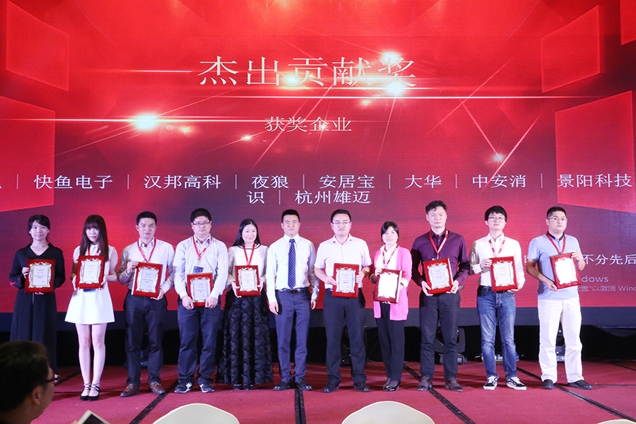 “中國(guó)安防行業(yè)優(yōu)質(zhì)供應(yīng)商”頒獎(jiǎng)現(xiàn)場(chǎng)(左一為中安消物聯(lián)傳感代表)