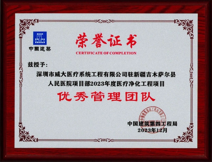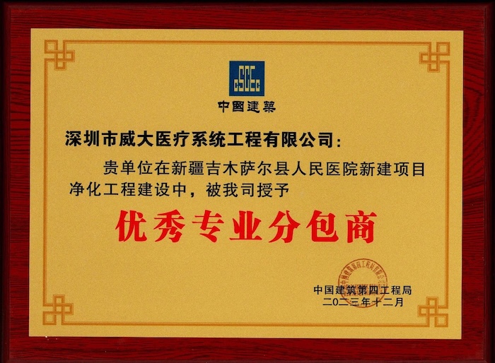 近日,中安科子公司深圳市威大醫(yī)療系統(tǒng)工程有限公司在承建的新疆吉木薩爾縣人民醫(yī)院新建項目凈化工程中,被總包單位中國建筑第四工程局授予“優(yōu)秀專業(yè)分包商”的榮譽稱號;同時,公司駐新疆吉木薩爾縣人民醫(yī)院項目部,也在2023年度醫(yī)療凈化工程項目中,被評為“優(yōu)秀管理團隊”。