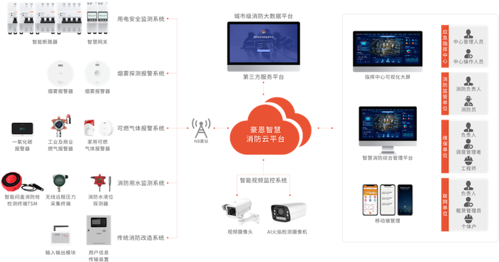 豪恩智慧消防解決方案以云平臺核心,搭載煙霧探測報警、可燃氣體報警、用電安全監(jiān)測、消防用水監(jiān)測等各個系統(tǒng),充分運用5G、大數(shù)據(jù)、云計算、人工智能等前沿技術(shù),建成由監(jiān)控服務(wù)中心、云平臺、移動應(yīng)用、智能設(shè)備等組成的智慧消防火災(zāi)防控預(yù)警一張網(wǎng),實現(xiàn)水、電、煙、氣、火等在內(nèi)的實時監(jiān)測,讓火災(zāi)隱患無處遁形,打通智慧消防最后一厘米,讓消防更智慧,讓城市更安全。