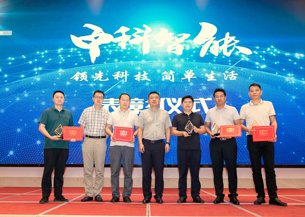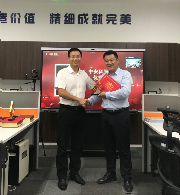 表彰大會上,由中安科股份公司副總裁兼江蘇中科智能總經(jīng)理查磊先生為項目組成員、劉松峰、王永亮、朱浩頒發(fā)了獎杯、榮譽(yù)證書及感謝信。